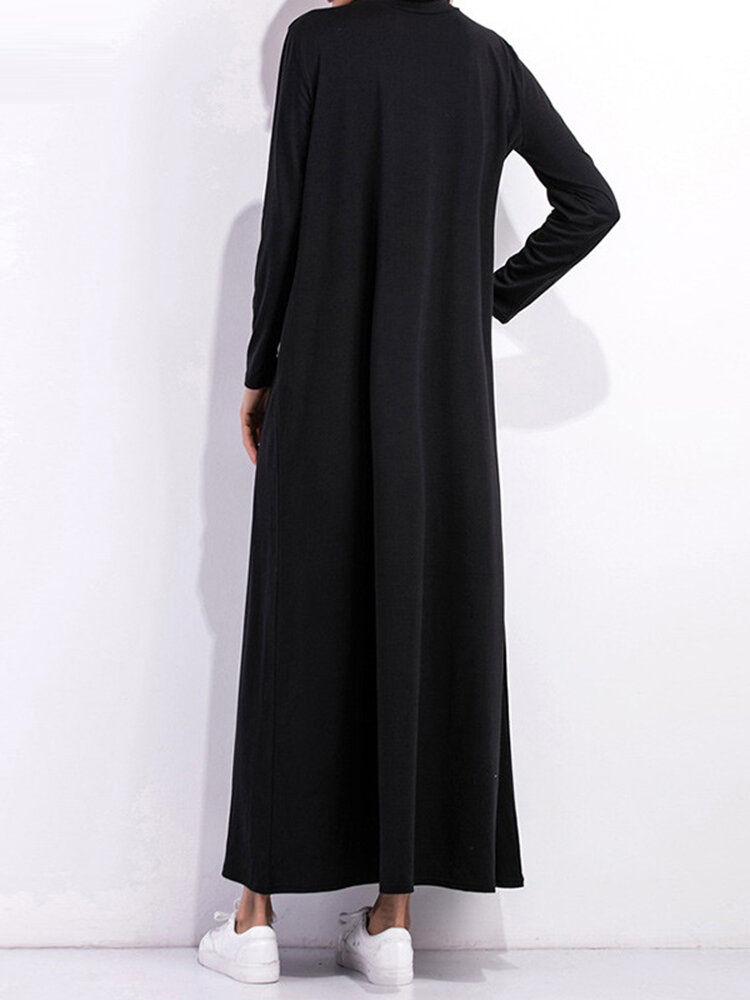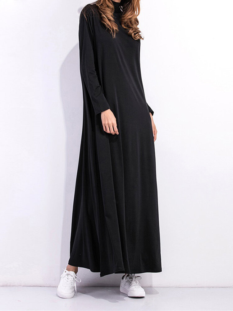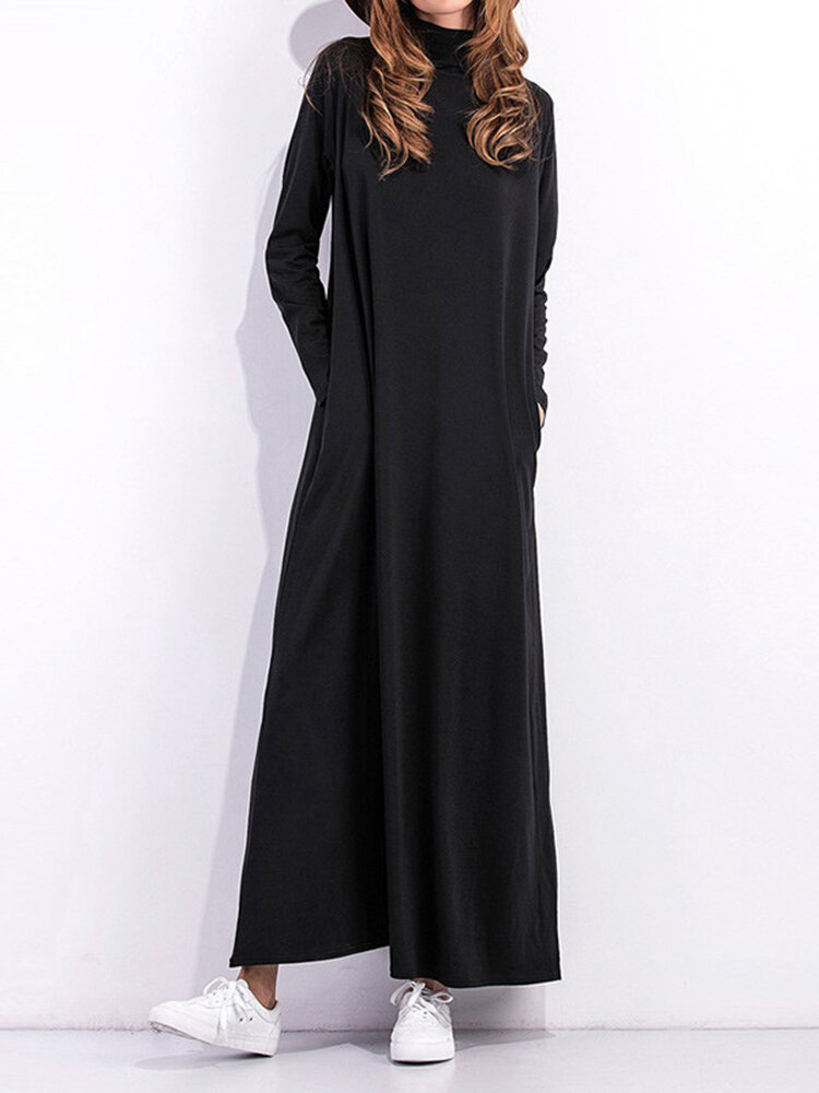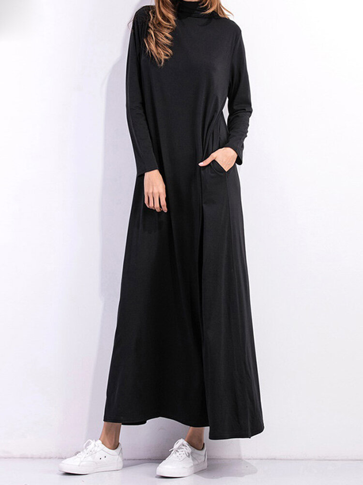 • Casual Women Long Sleeve Pure Color Turtleneck Pocket Long Dress