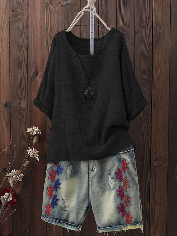 Plus Size Vintage Round Neck 3/4 Sleeve Women Blouse