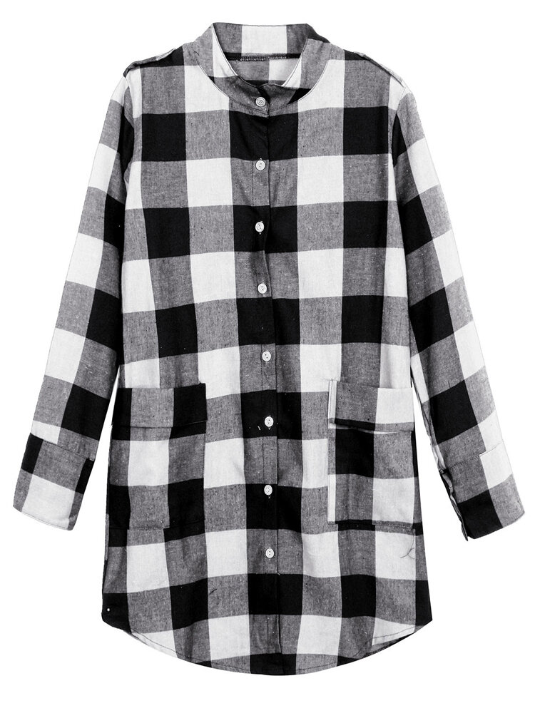 Women Casual Long Sleeve Plaid Loose Pocket Button Long Blouses COD