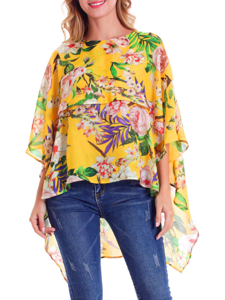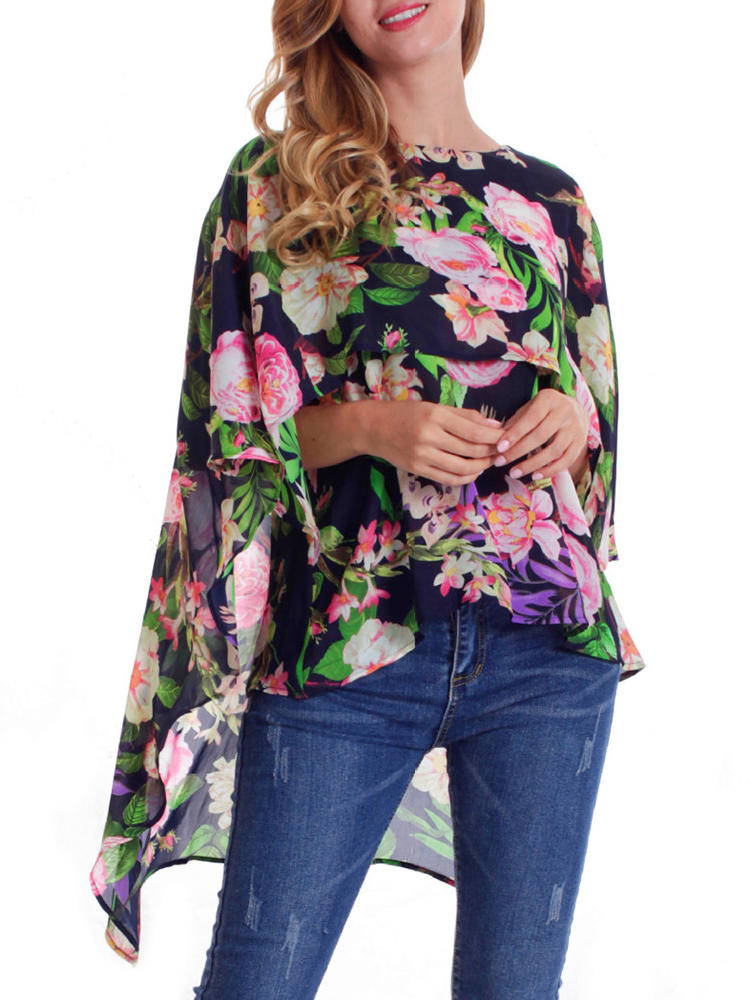 Women O-neck Floral Print Batting Sleeve Irregular Blouse