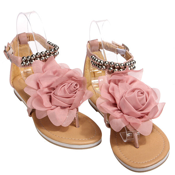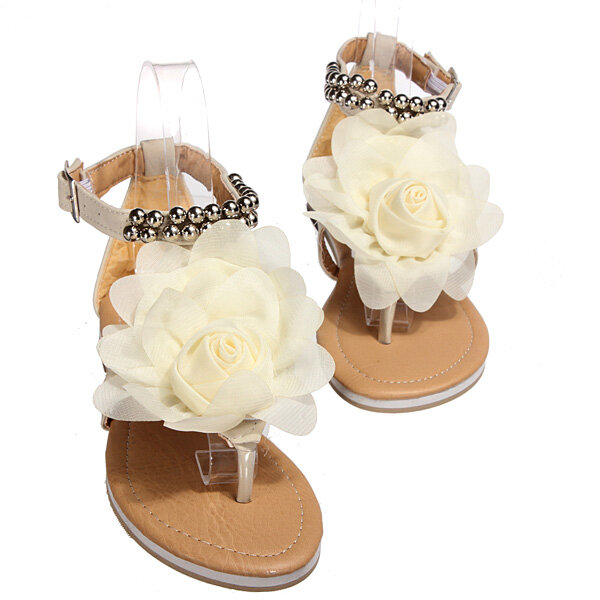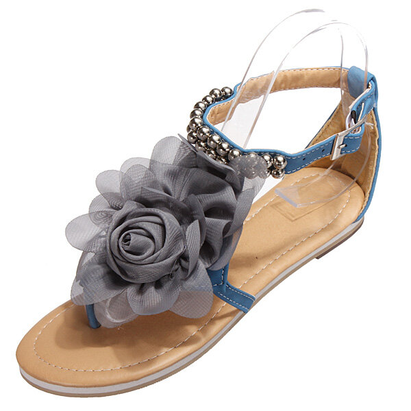 Chiffon Fabric Flower Flats T Straps Sandals Beach Shoes